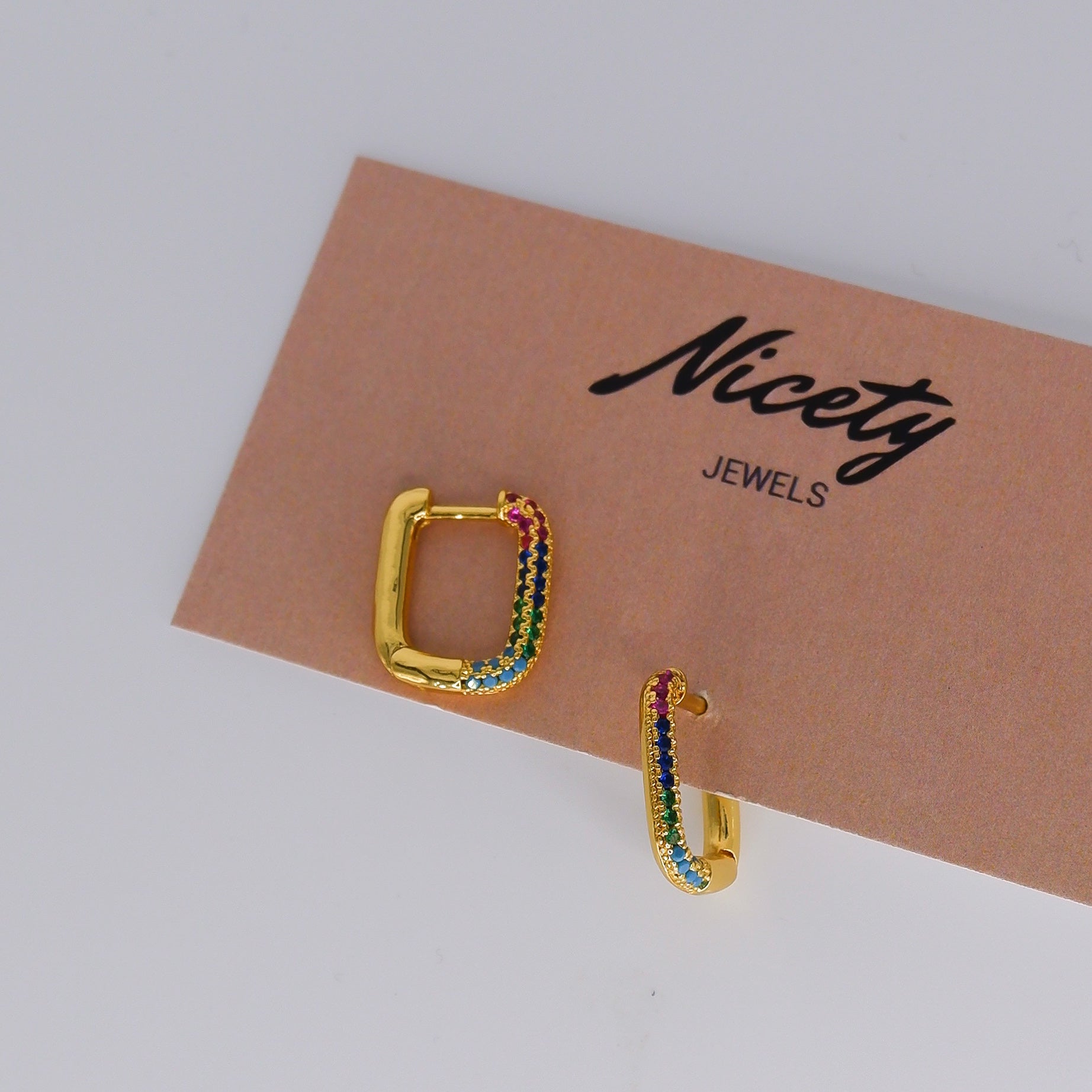 Argola Quadrada Dourada com Brilhantes Coloridos
