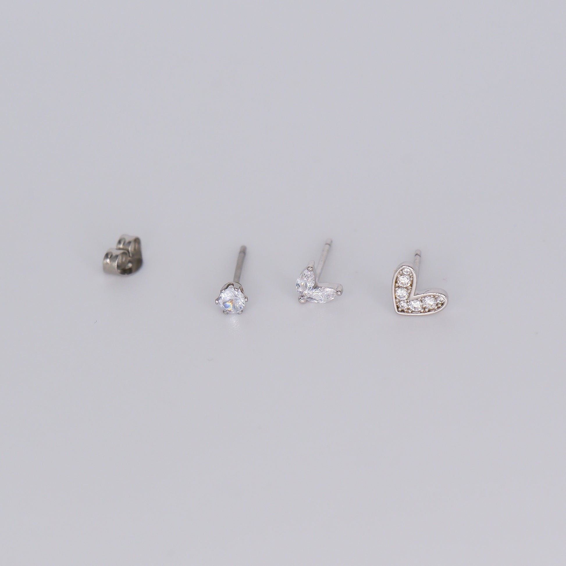 Brincos de Espeto Prateados Coração Grande, Ponto de Luz e Folhas