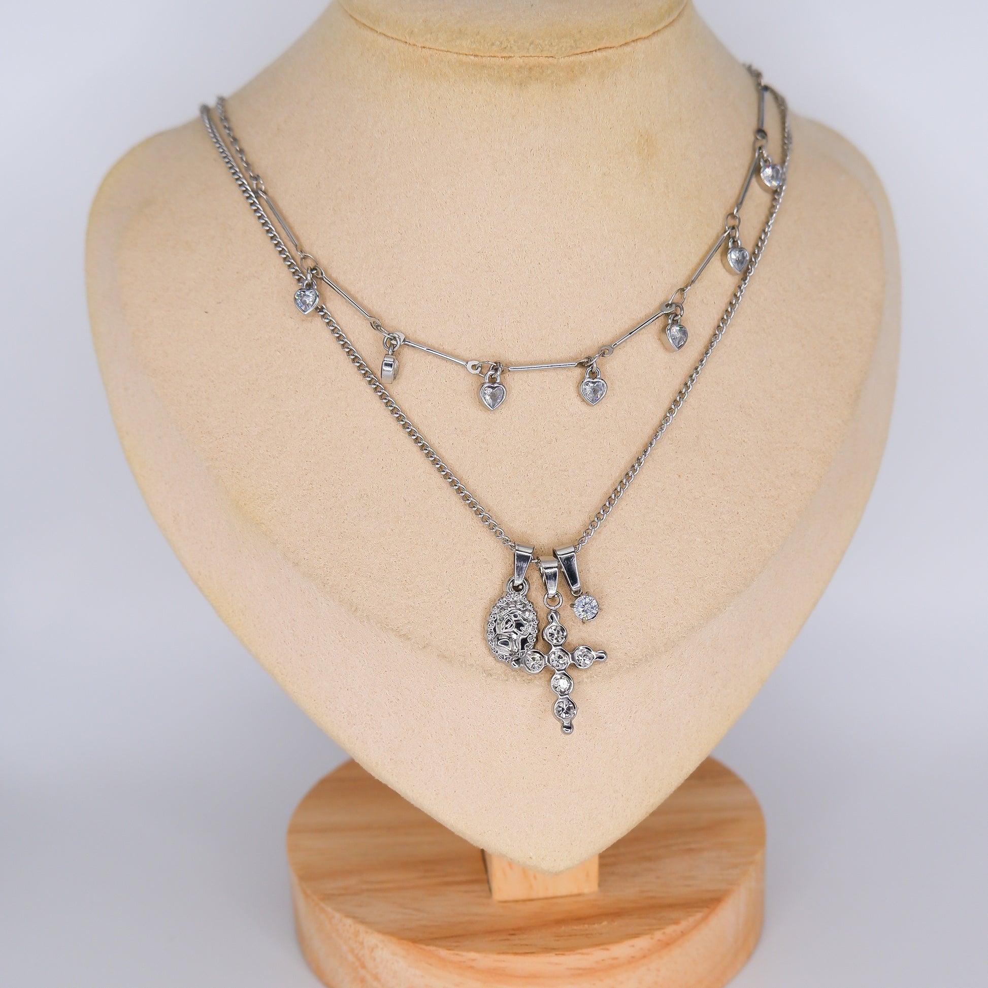 Colar Corações Brilhantes e Cruz