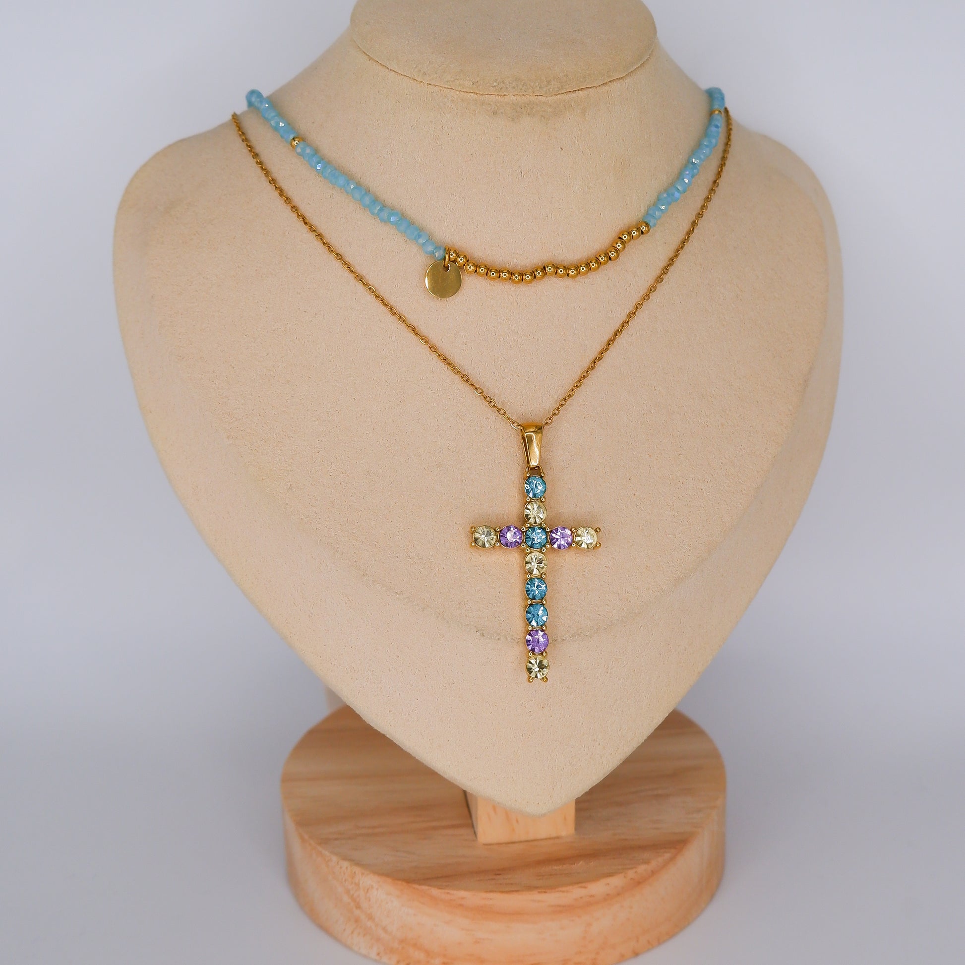 Colar Cruz com Brilhos Azuis e Miçangas Azuis com Medalha