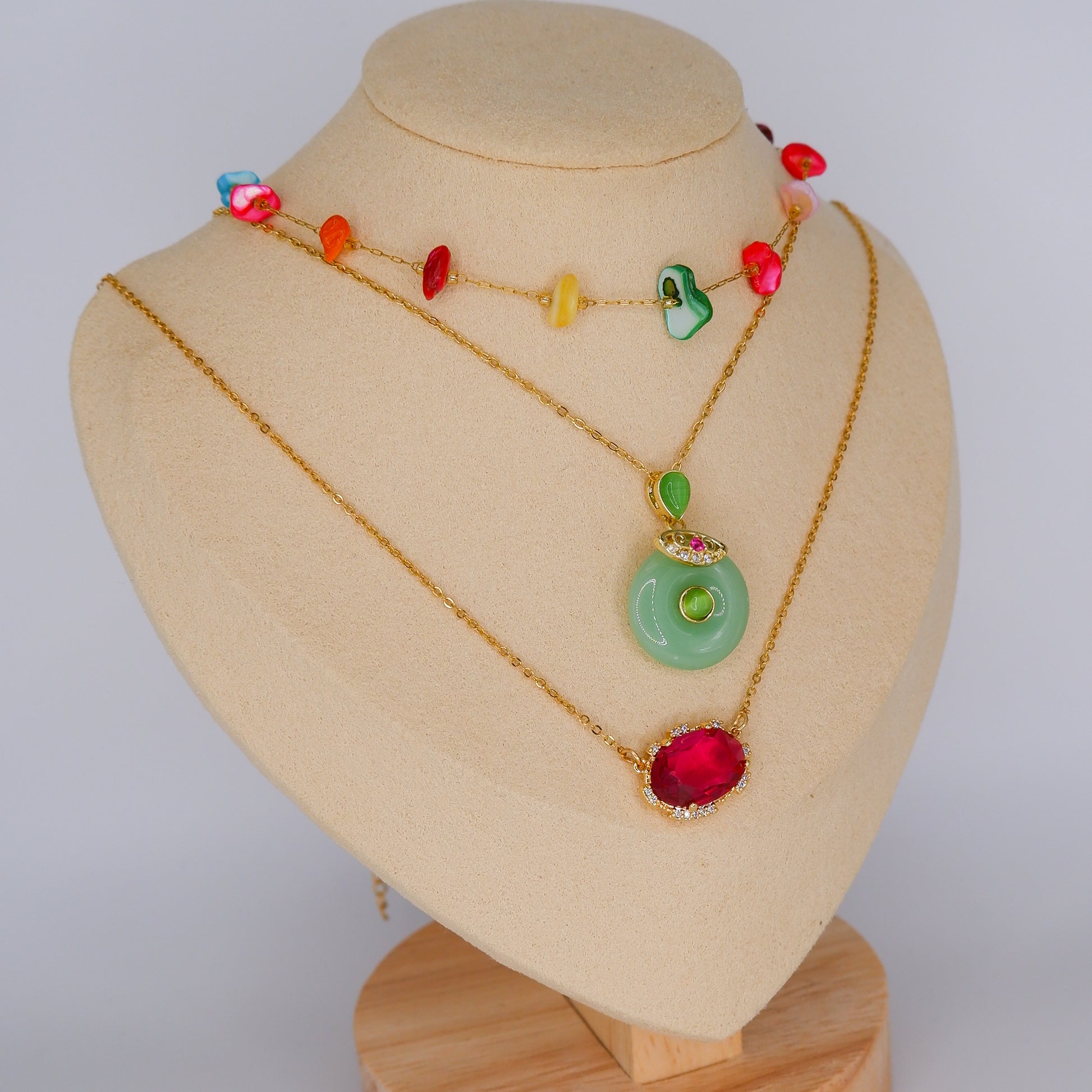 Colar Dourado Pedras Coloridas, Verde e Rosa