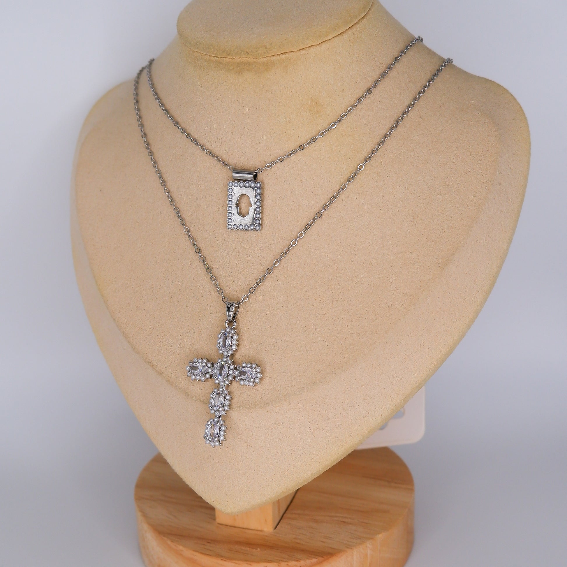Colar Medalha Mão e Cruz Brilhante Prateado
