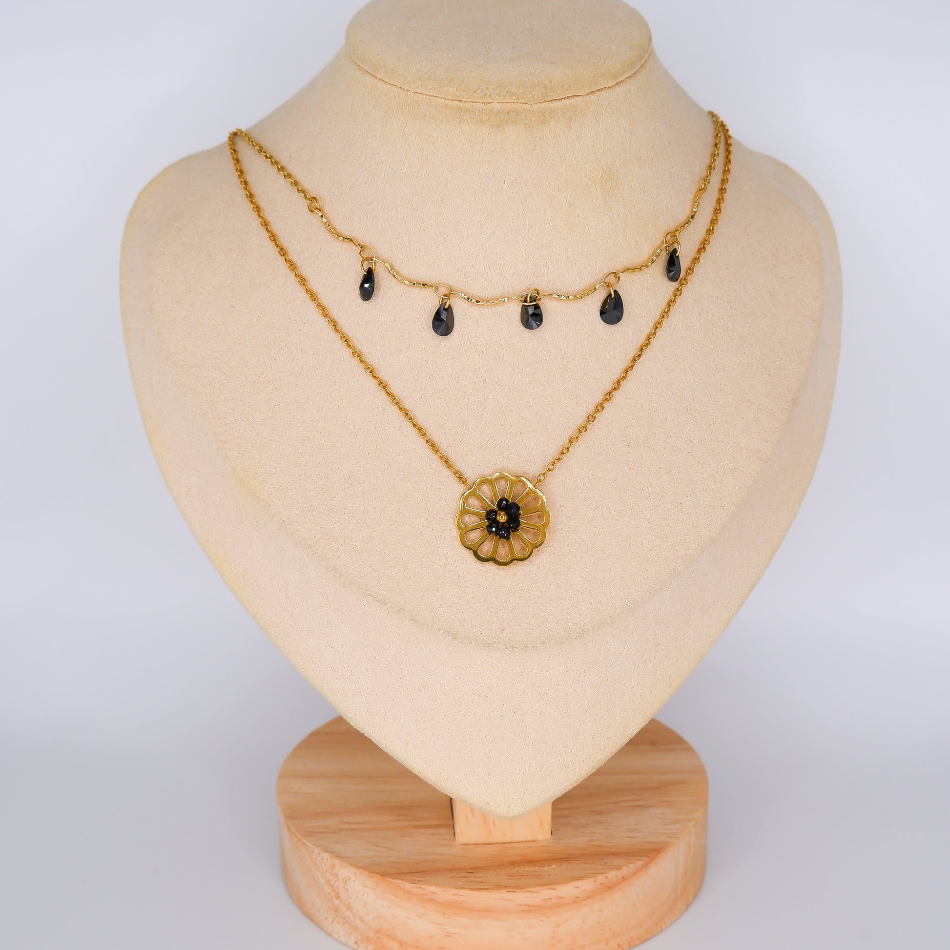 Colares Brilhos Pretos Pendentes e Pendente Flor