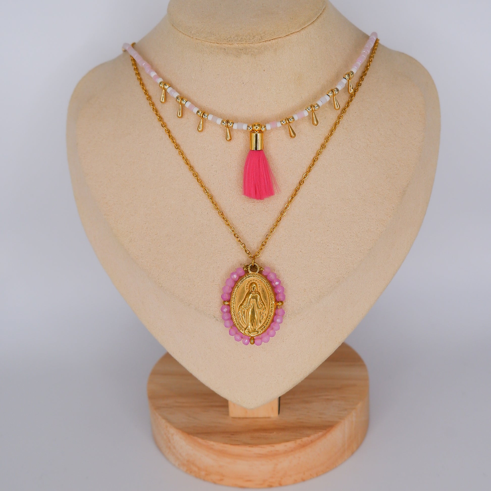 Colares Escapulário com Pedras Rosa e Miçangas Rosa com Pendente