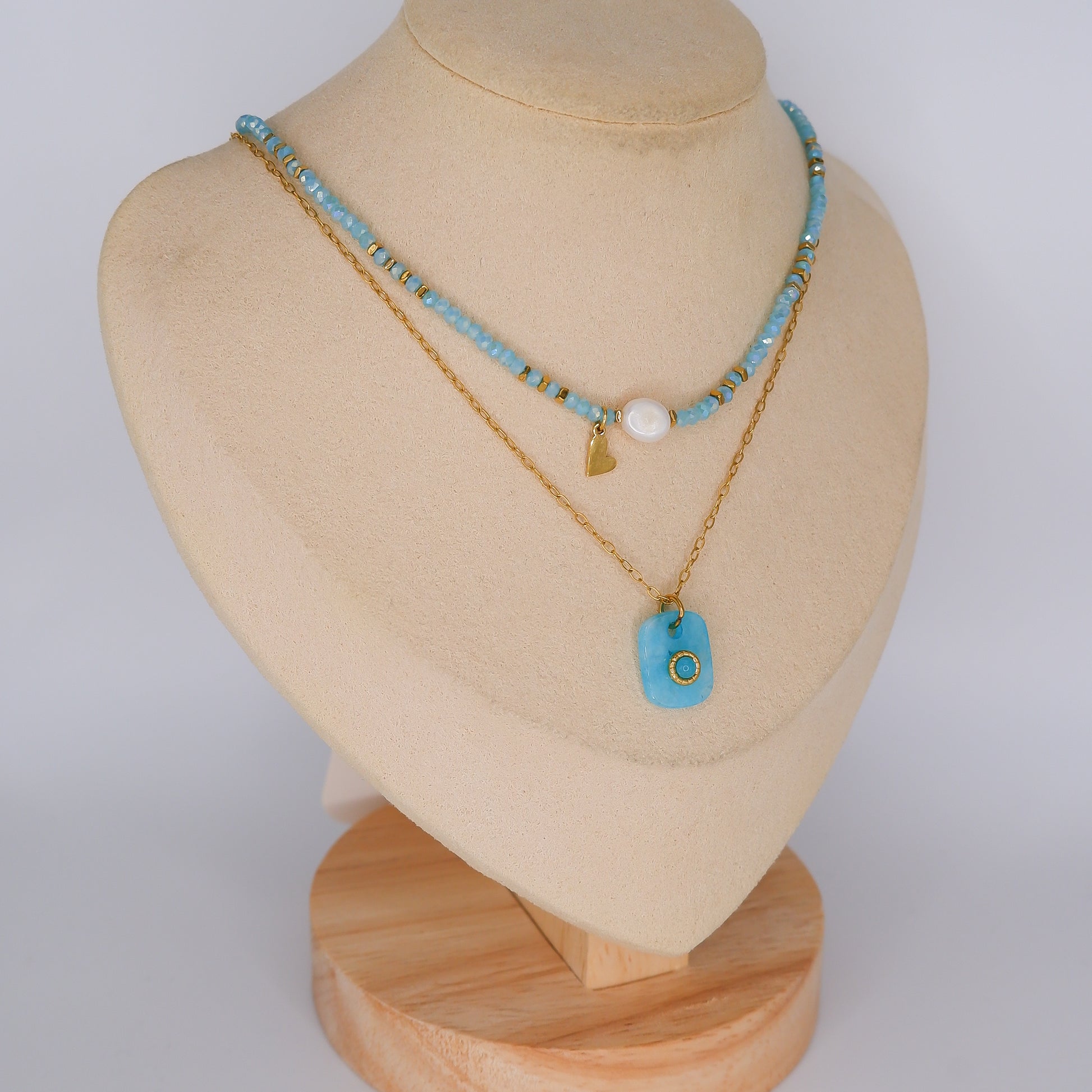 Colares Miçangas Azuis com Pérola e Pedra Azul Pendente