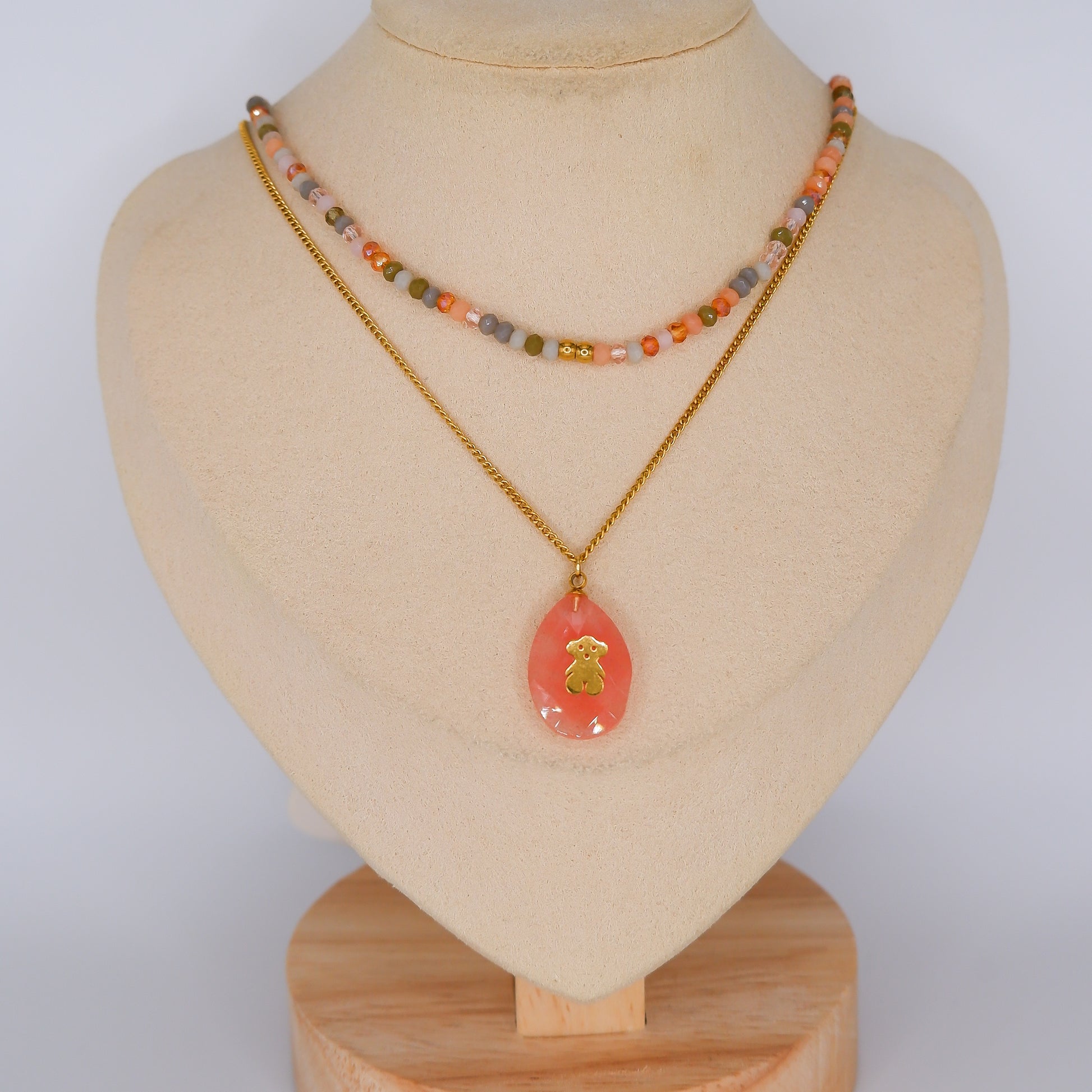 Colares Miçangas Coloridas e Pendente Rosa com Urso