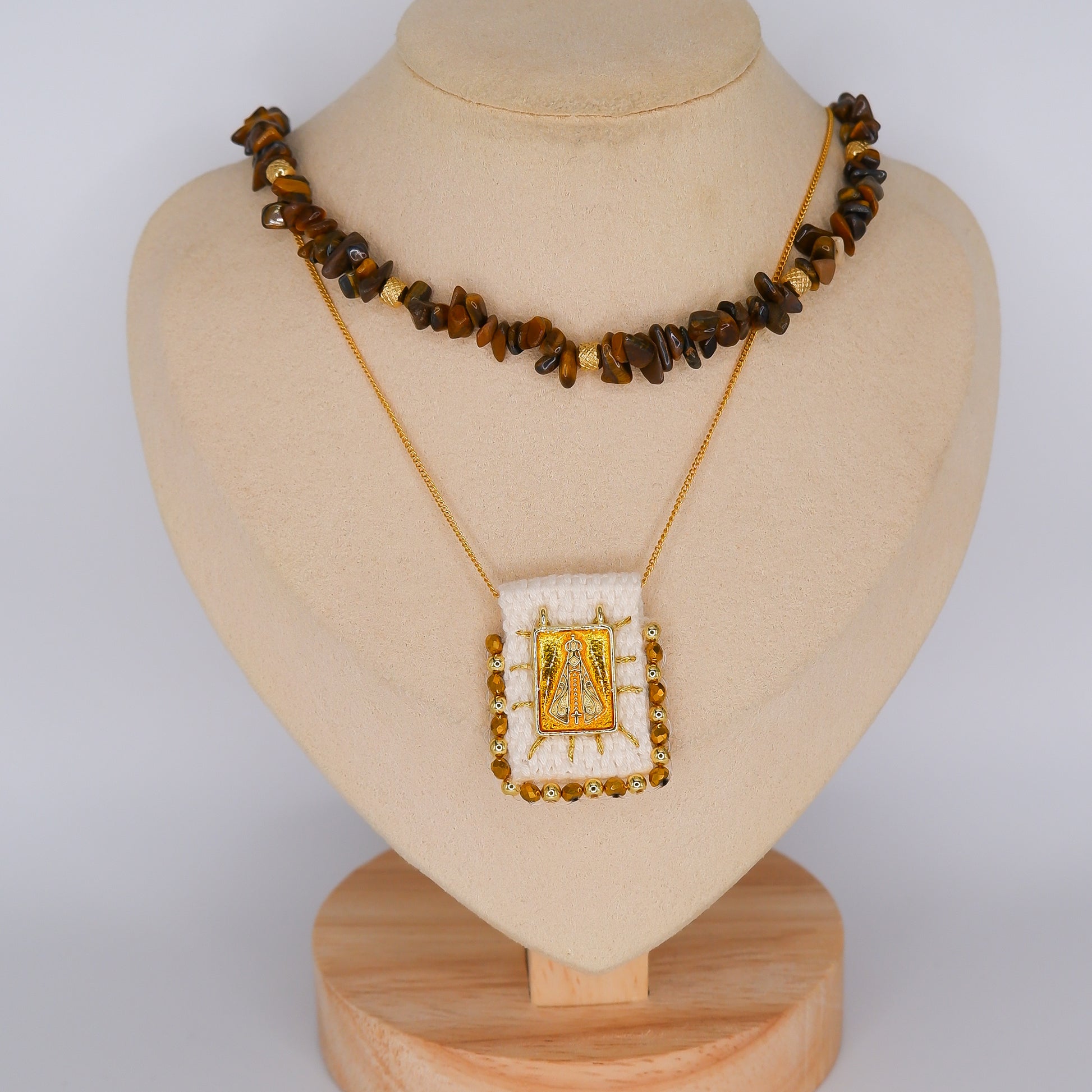 Colar Medalha Fé de Tecido com Amarelo e Pedras Castanhas