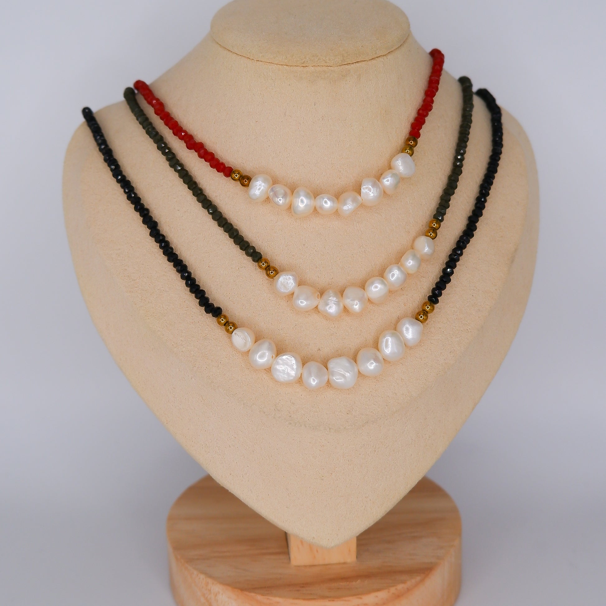 Colares Pérolas com Pedras Pretas/Cinza/Vermelhas