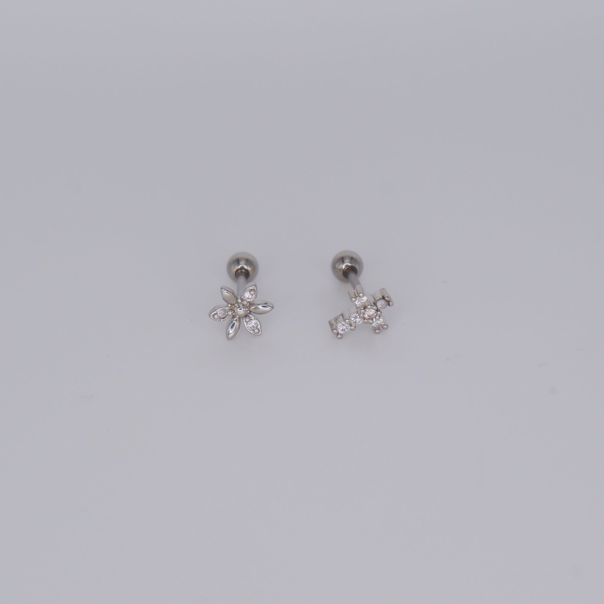 Piercing Bolinha Aço Inoxidável Prateado Flor e Cruz