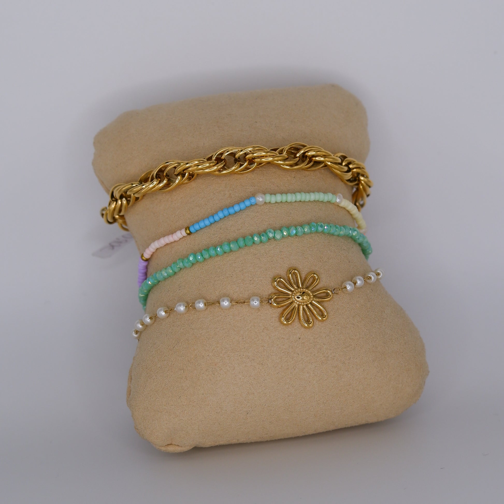 Pulseira Aço Inoxidável Malha, Missangas e Flor