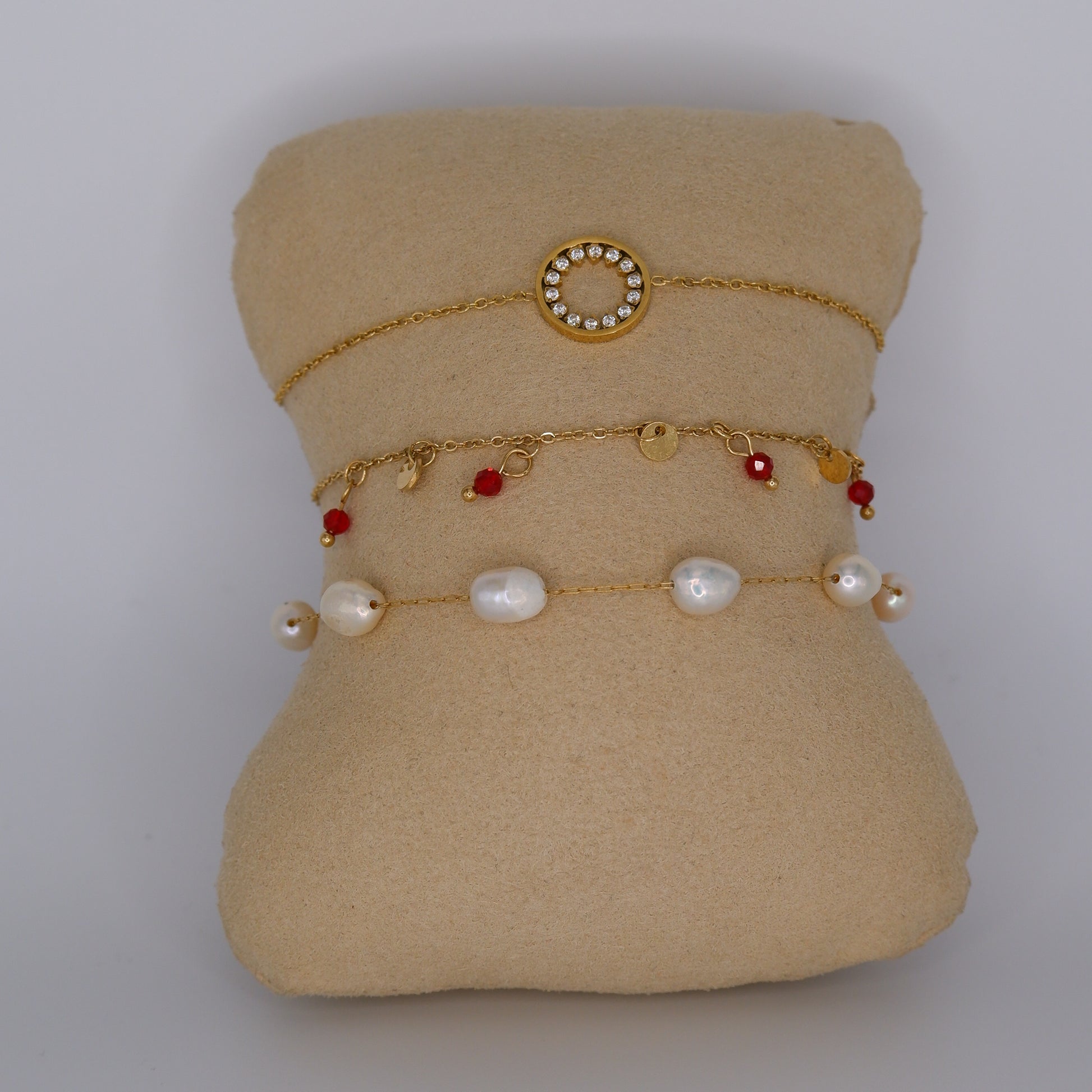 Pulseira Aço Inoxidável Círculo, Pendentes e Pérolas