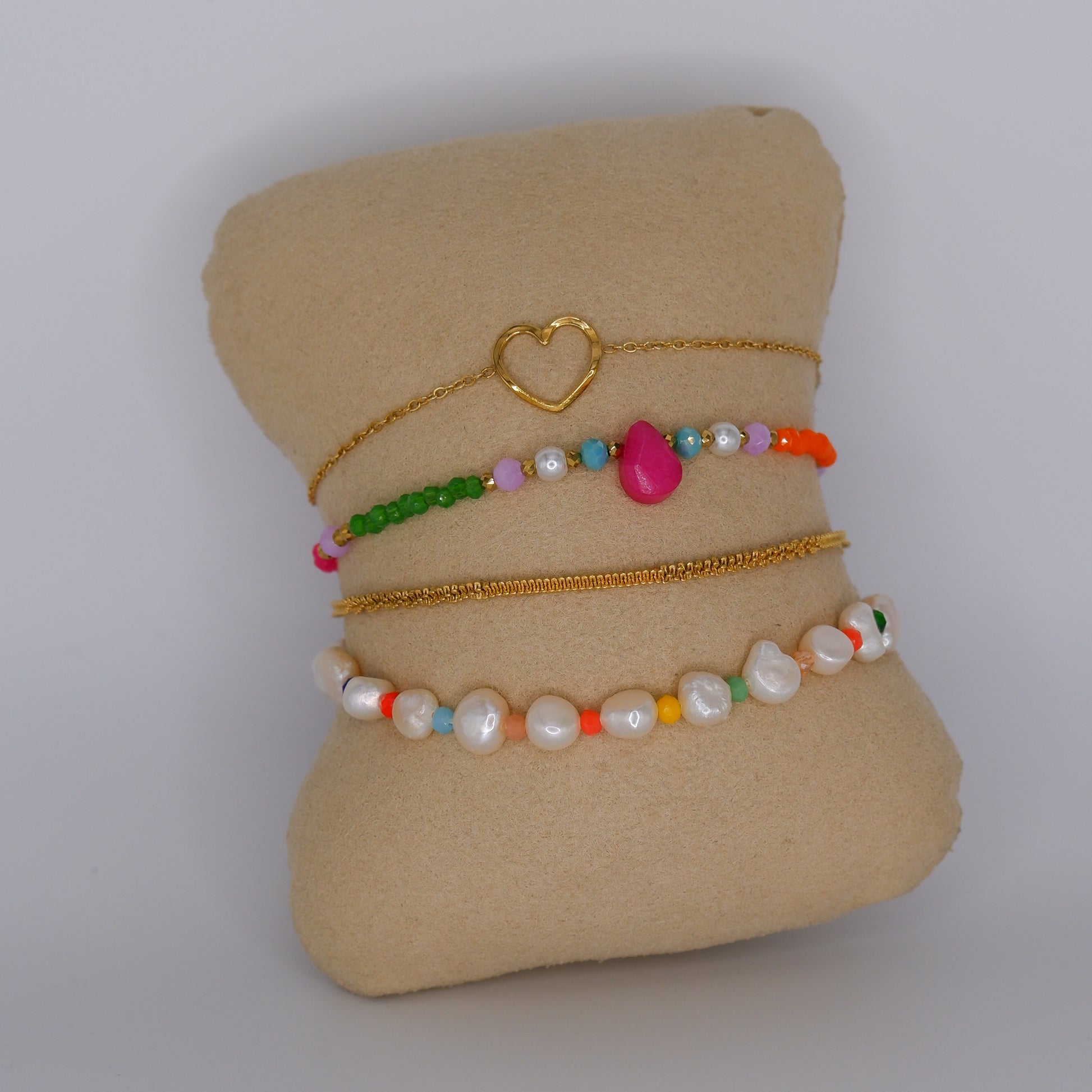 Pulseira Aço Inoxidável Coração, Missangas, Malha e Pérolas