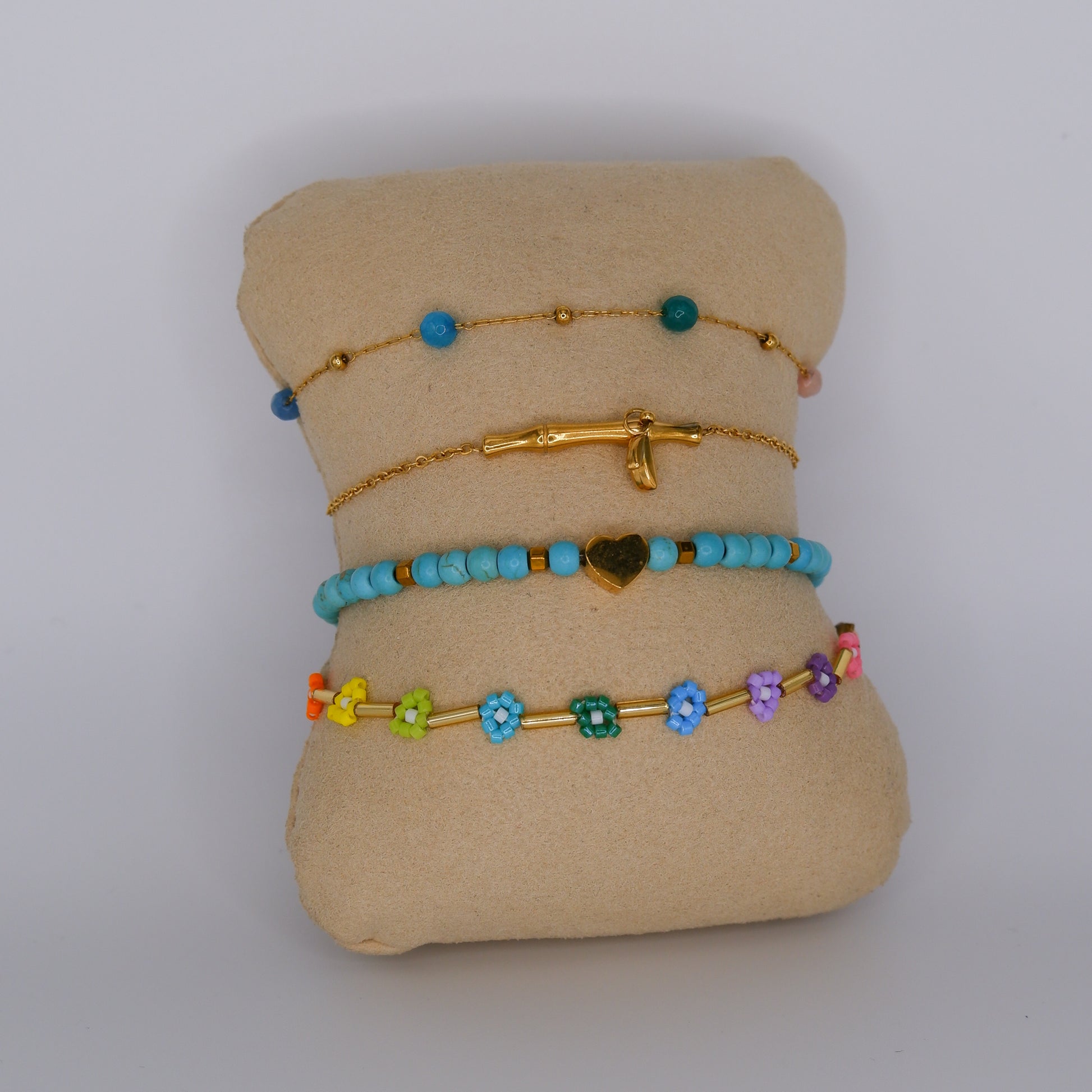 Pulseira Aço Inoxidável Bolas, Bamboo, Azul e Flores