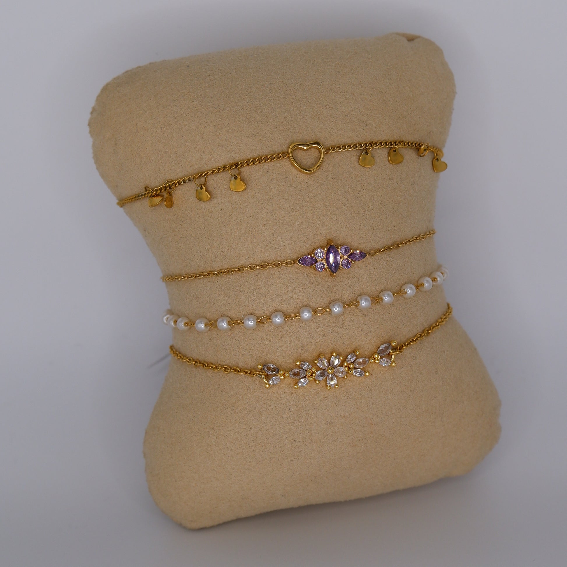 Pulseira Aço Inoxidável Corações, Pérolas e Brilhantes