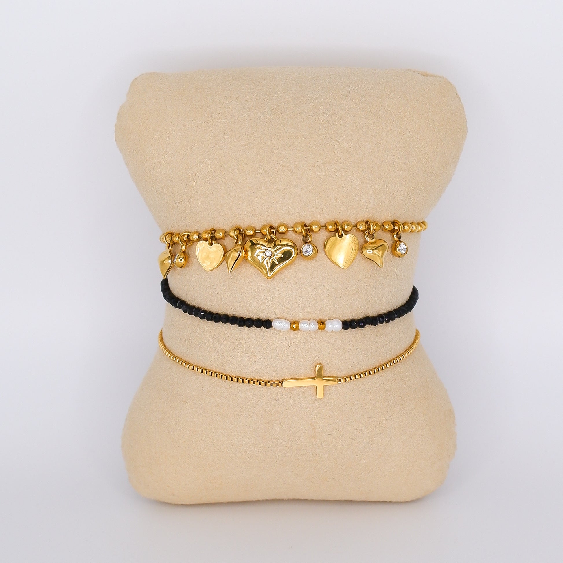 Pulseira Aço Inoxidável Pendentes Coração, Pedras Pretas e Cruz