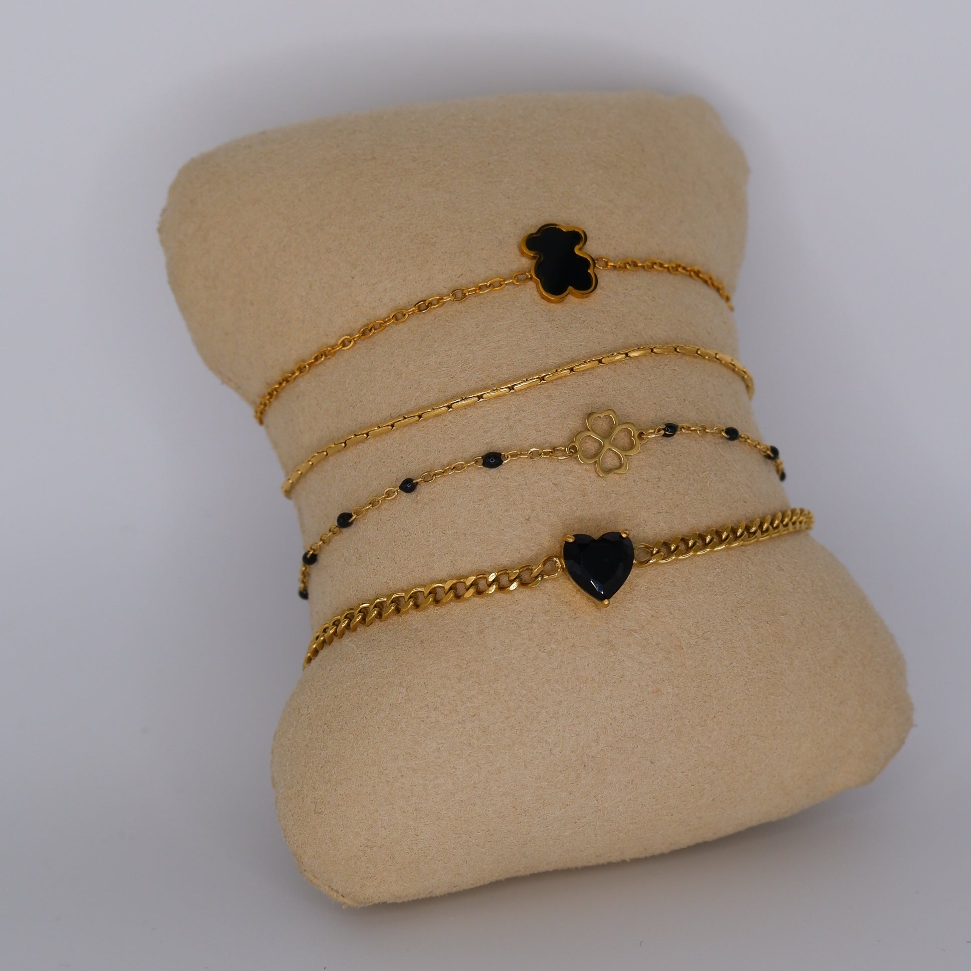 Pulseira Aço Inoxidável Urso, Malha, Trevo e Coração Preto