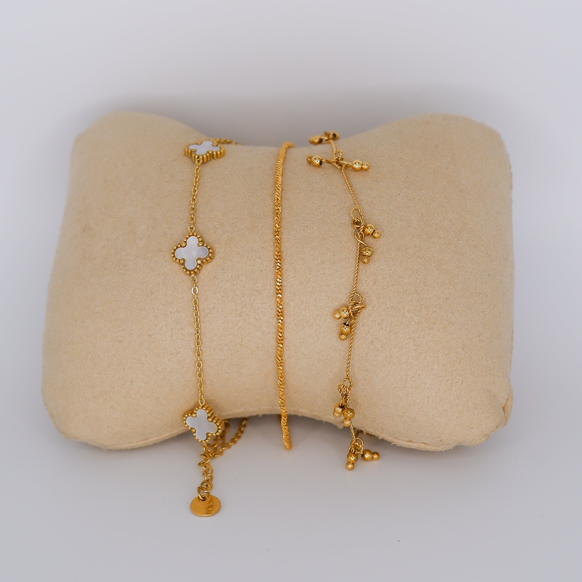 Pulseira Pé Dourada Trevo, Malha e Pendentes