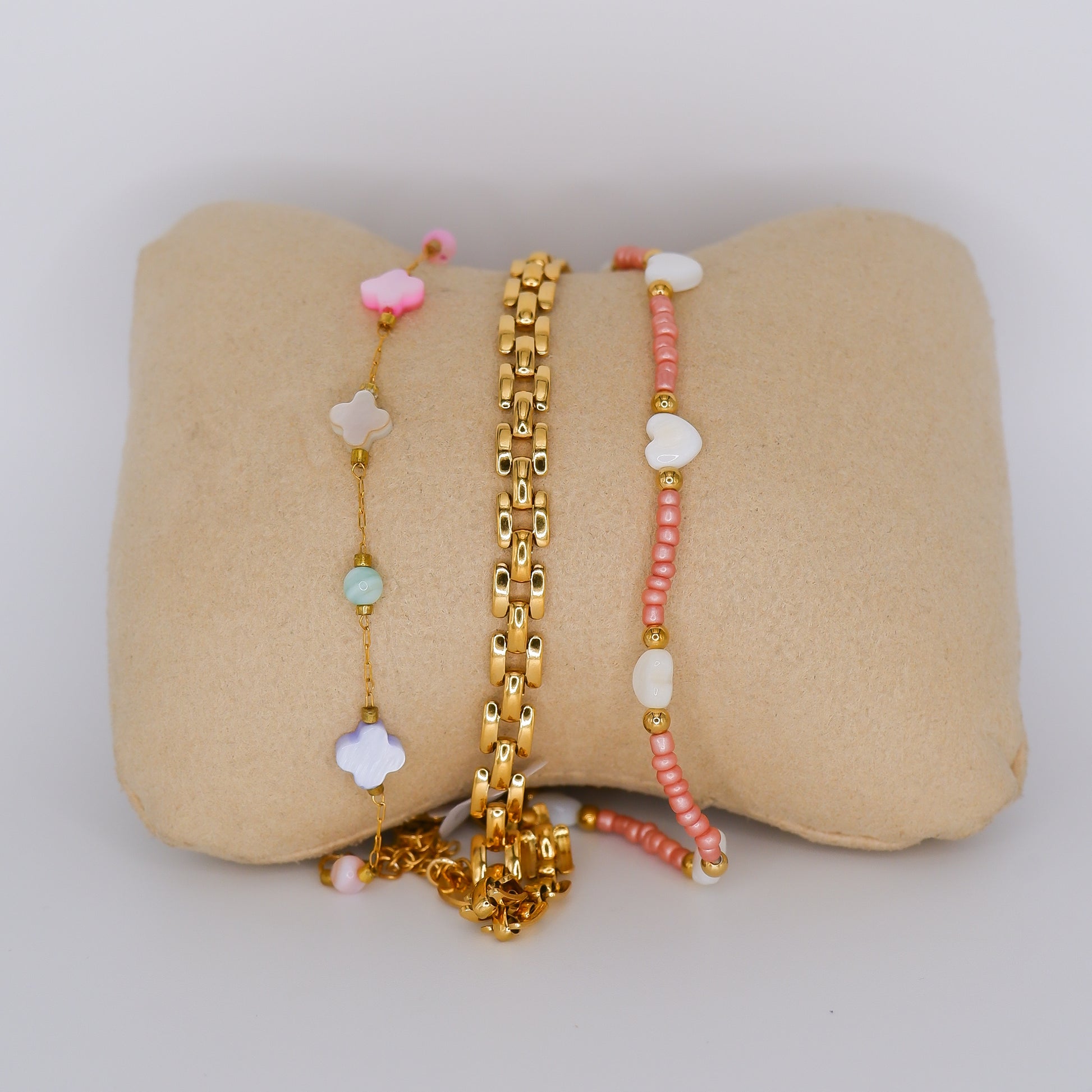 Pulseira Pé Dourada Trevos, Malha e Corações
