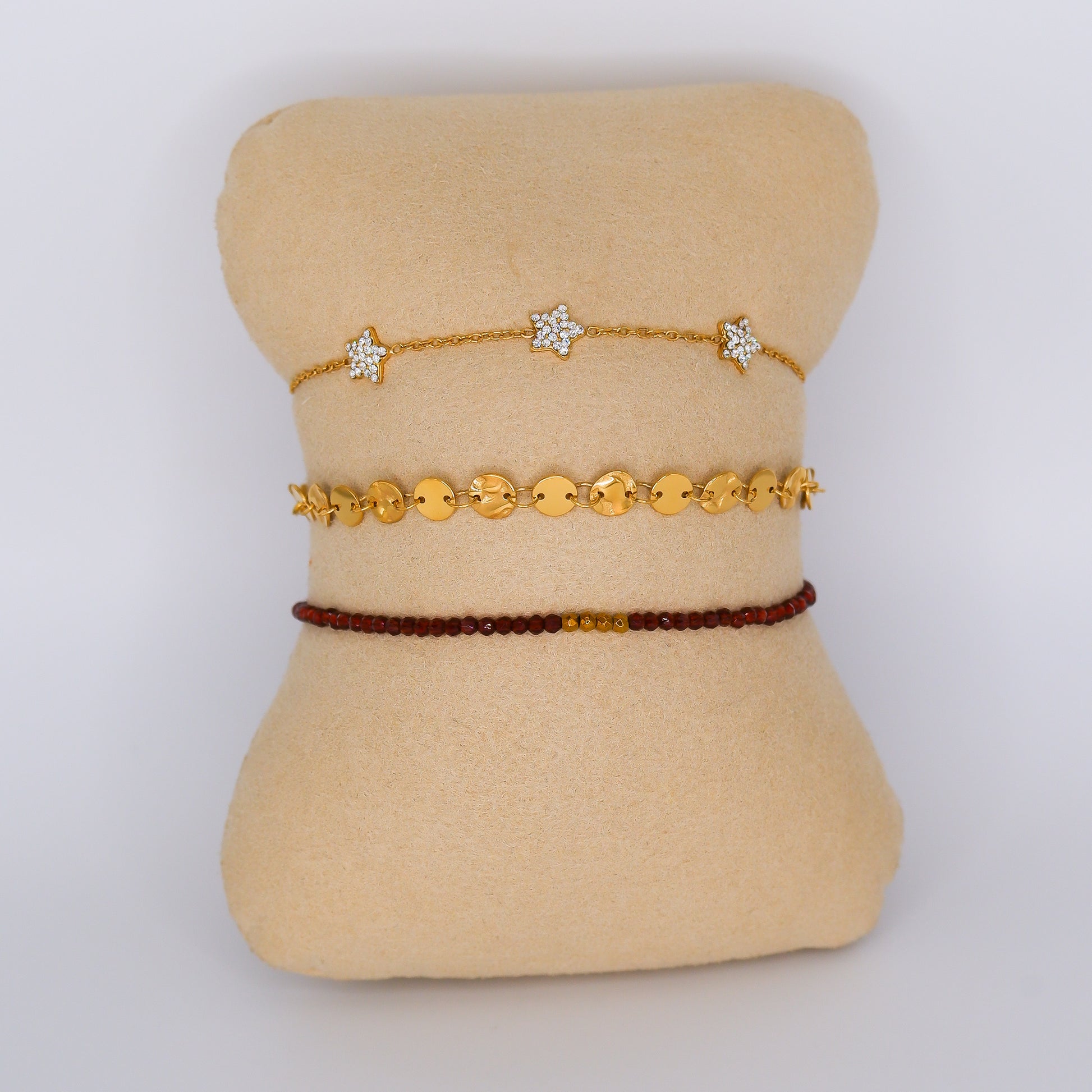Pulseira Aço Inoxidável Estrelas, Círculos e Pedras Vermelhas