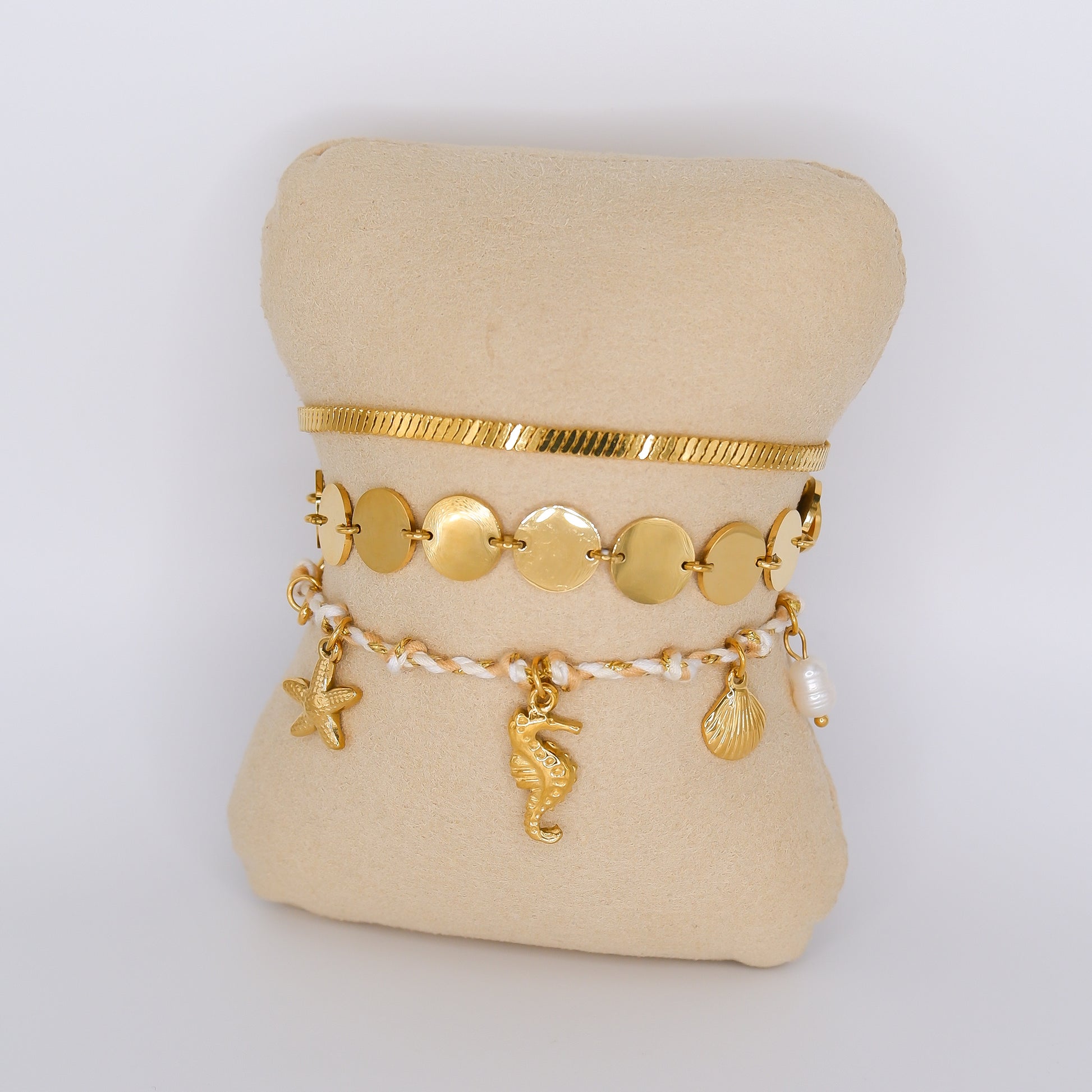 Pulseira Aço Inoxidável Bolas Achatadas, Malha Cobra, Pendentes Marinhos