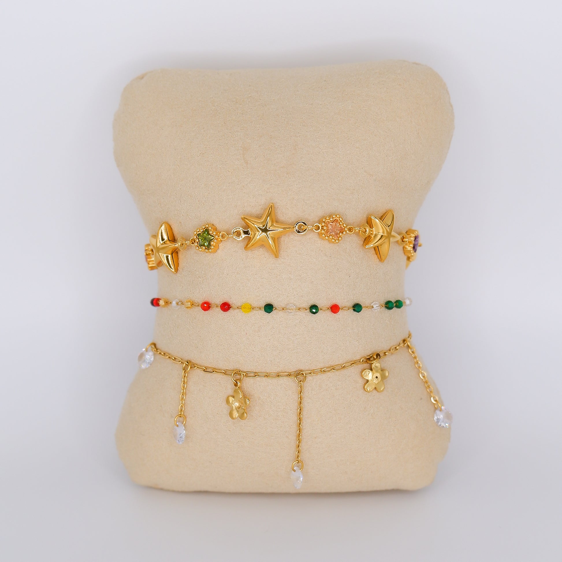 Pulseira Aço Inoxidável Estrelas, Flores Pendentes e Missangas Coloridas