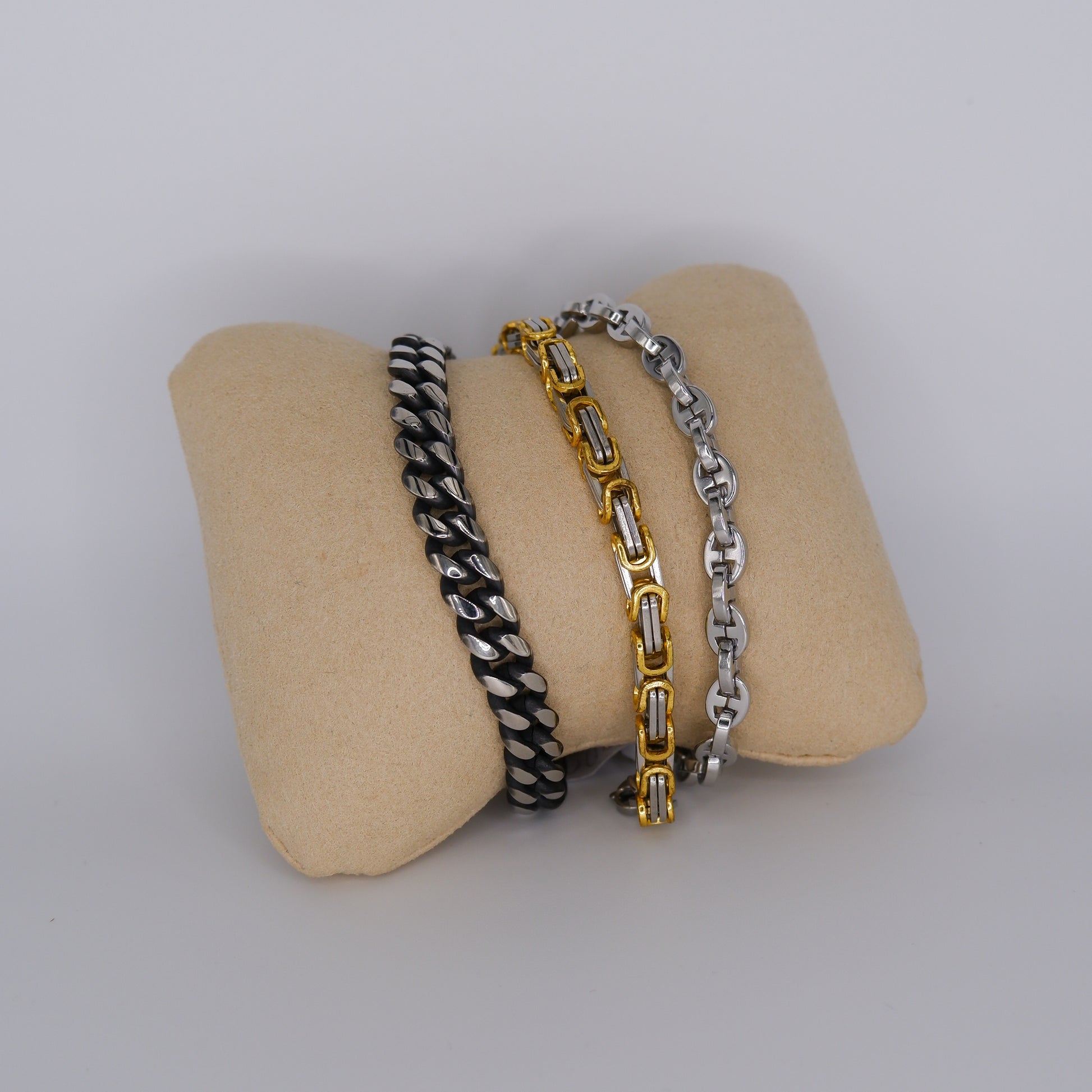 Existem 3 materiais diferentes:aço, material hipoalergenico e Prata S925.